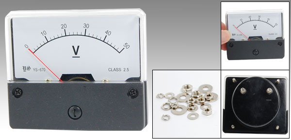 Product Name Analog Voltmeter Model YS-670 Measuring Voltage Range DC 0-50V Accuracy Class 2.5 Meter Face Size(Approx) 7 x 5.8 x 1.2cm/ 2.7" x 2.3" x 0.5"(L*W*T) Thread Size 0.4 x 1cm / 0.15" x 0.4"(D*L) 0.3 x 0.9cm/ 0.11" x 0.35"(D*L) Overall Depth 3.5cm/ 1.4" Color Black, White Net Weight 72g Package Content 1 x Analog Voltmeter Several Installing Parts - Reviews