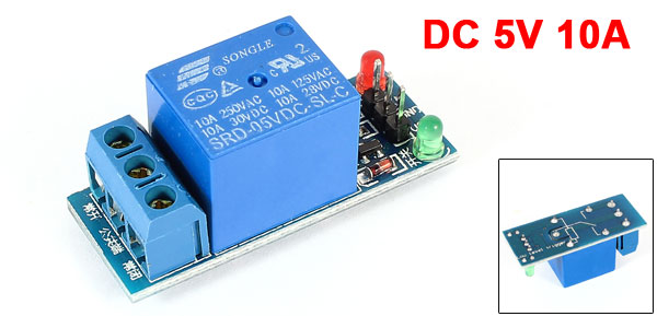 Product Name Relay Module Model SRD-05VDC-SL-C Material Electronic Parts Number of Channels 1 Voltage DC 5V Load 10A, AC 250V/125V, DC 30V/28V Size 43 x 17 x 18mm/ 1.7" x 0.67" x 0.7" (L*W*H) Color Blue Weight 17g Package 1 x Relay Module - Reviews