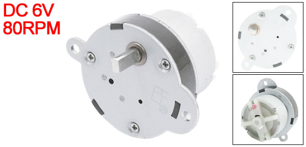 Product Name DC Geared Box Motor Rated Voltage DC 6V Motor Rotary Speed 80RPM Pin Number 2 Shaft Size 5 x 10mm/ 0.2" x 0.4"(D*L) Fixing Hole Dia 3.5mm/ 0.14" Fixing Hole Center Distance 46mm/1.8" Motor Size 19 x 32mm/0.35" x 1.3"(L*D)