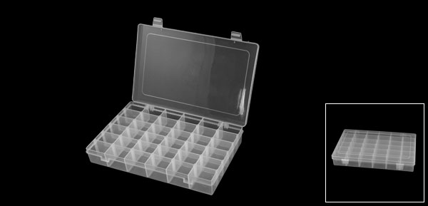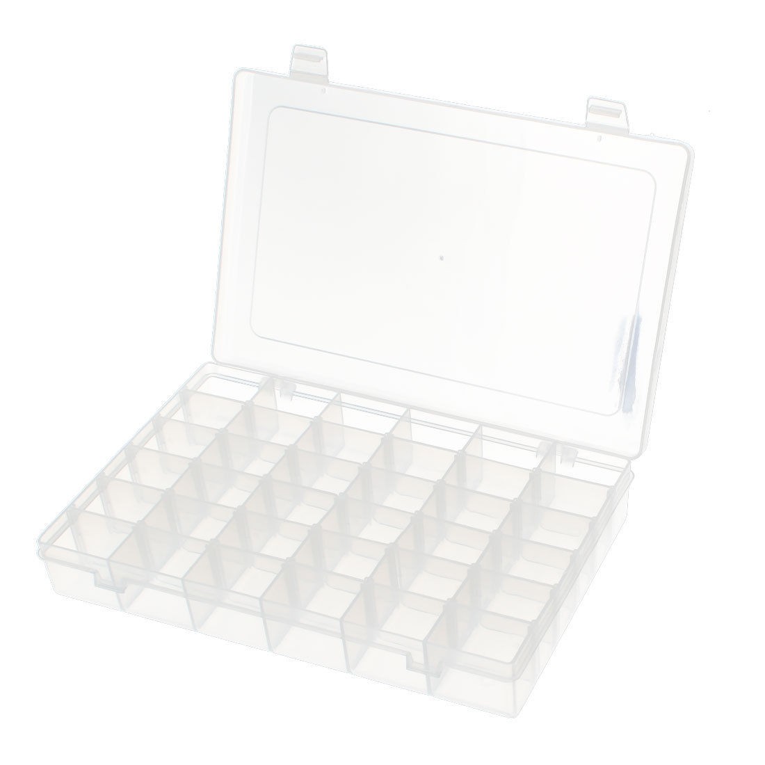 Product Name Components Box Material Plastic Color Clear Compartments 36 (Detachable) External Size 27 x 17.5 x 4cm / 10.5" x 7" x 1.6" (L*W*H) Grid Size (Min.) 4 x 2.5 x 3.5cm / 1.6" x 1" x 1.4" (L*W*H) Weight 316g Package Content 1 x Components Box