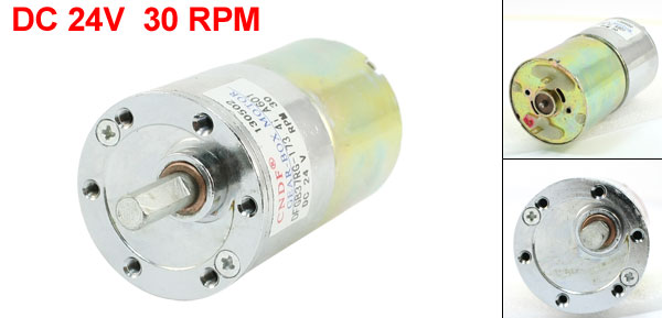 Product Name DC Geared Motor Model DFGB37RG-173.4i Rated Voltage DC 24V Output Speed 30 RPM Shaft Diameter 6mm/ 0.236" Gearbox Part Diameter 37mm/ 1.456" Motor Part Diameter 35.5mm/ 1.397" Total Length(Approx.) 83mm/ 3.3" Material Metal, Electronic Parts Color Silver Tone Weight 210g Package Content 1 x DC Geared Motor  - Reviews
