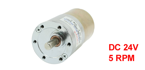 Product Name DC Geared Motor Model DFGB37RG-560i Rated Voltage DC 24V Output Speed 5 RPM Shaft Diameter 6mm/ 0.236" Gearbox Part Diameter 37mm/ 1.456" Motor Part Diameter 35.5mm/ 1.397" Total Length(Approx.) 85mm/ 3.3" Material Metal, Electronic Parts Color Silver Tone Weight 210g Package Content 1 x DC Geared Motor - Reviews