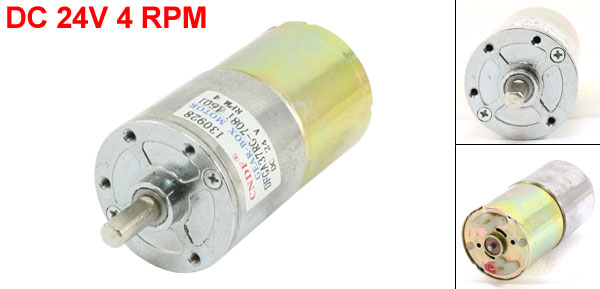 DetailsDFGB37RG-708i Cylinder Shape DC 24V Speed 4 RPM Geared Motor  Product Name DC Geared Motor Model DFGB37RG-708i Rated Voltage DC 24V Output Speed 4 RPM Shaft Diameter 6mm/ 0.236" Gearbox Part Diameter 37mm/ 1.456" Motor Part Diameter 35.5mm/ 1.397" Total Length(Approx.) 83mm/ 3.3" Material Metal, Electronic Parts Color Silver Tone Weight 210g Package Content 1 x DC Geared Motor