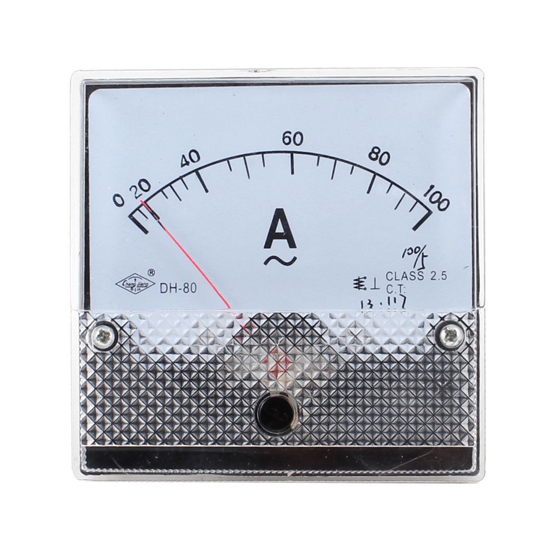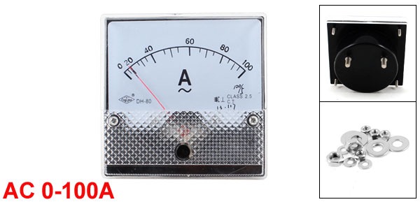 Product Name Analog Ammeter Model No. DH-80 Measuring Current Range AC 0-100A Accuracy Class 2.5 Meter Front Size(Approx.) 80 x 80 x 14mm / 3.1" x 3.1" x 0.6"(L*W*T) Thread Dia Big: 5mm / 0.2"
