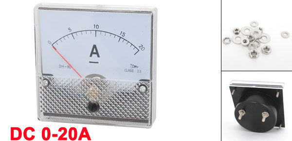 Product Name Analog Ammeter Model No. DH-80 Measuring Current Range DC 0-20A Accuracy Class 2.5 Panel Size 8.2 x 8.2cm / 3.23" x 3.23" (L*W) Thread Dia 3mm/0.12"
