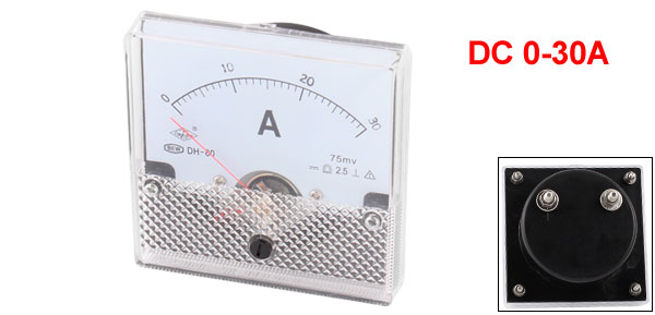 Product Name Analog Ammeter Model No. DH-80 Measuring Current Range DC 0-30A Accuracy Class 2.5 Panel Size 8.2 x 8.2cm / 3.23" x 3.23" (L*W) Thread Dia 3mm/0.12"