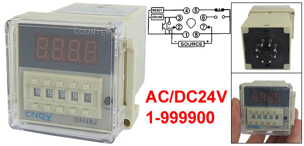 DetailsDH48J 1-999900 Digital Counter Relay LED Display AC/DC 24V 50/60Hz  Product Name Digital Counter Relay Model DH48J Count Range 1-999900 Power Source AC/DC24V, 50/60Hz Contact AC 250V 5A ( Resistive Load) Count Speed <300cps Digit Display 4 Pin Number 8 Marerial Plastic, Electrionic Parts Color Gray Size 10 x 5.5 x 5cm/4'' x 2.2'' x 2'' (L*W*H) Net Weight 95g Package Content 1 x Digital Counter Relay w Base