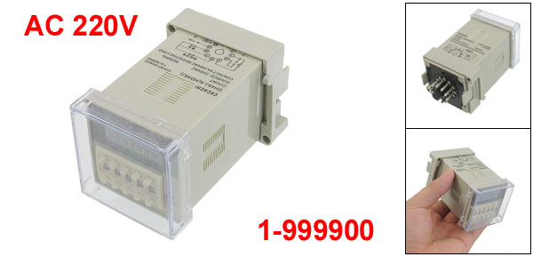 DetailsDH48J-A 220VAC 1-999900 Count Range 11 Pins Digital Counter Relay  Product Name Counter Relay Model DH48J-A Mounting Type Panel Mount Source 220VAC Frequency 50/60Hz Pin Quantity 11 Count Range 1-999900 Contacts Capacity 5A 250VAC Resistive Load Total Size(Approx) 5.7 x 4.9 x 10.5cm / 2.24" x 1.91" x 4.13" (L*W*H) Material Plastic, Metal Net Weight 177g Package Content 1 x Counter Relay