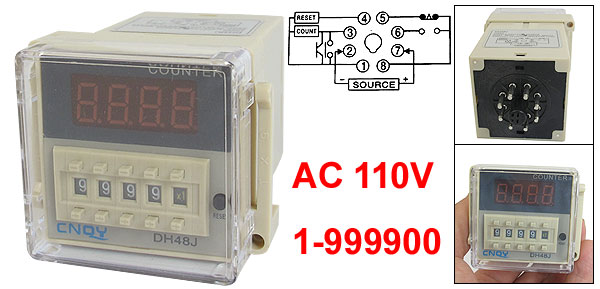 Product Name Digital Counter Relay Model DH48J Count Range 1-999900 Power Source AC110V, 50/60Hz Contact AC 250V 5A ( Resistive Load) Count Speed <300cps Digit Display 4 Pin Number 8 Marerial Plastic, Electrionic Parts Color Gray Size 10 x 5.5 x 5cm/4'' x 2.2'' x 2'' (L*W*H) Net Weight 175g Package Content 1 x Digital Counter Relay