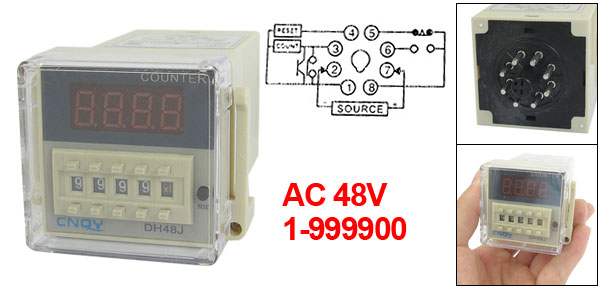 Product Name Digital Counter Relay Model DH48JA Count Range 1-999900 Power Source AC48V, 50/60Hz Contact AC 250V 5A ( Resistive Load) Count Speed <300cps Digit Display 4 Pin Number 8 Marerial Plastic, Electrionic Parts Color Gray Size 10 x 5.5 x 5cm/4'' x 2.2'' x 2'' (L*W*H) Net Weight 166g Package Content 1 x Digital Counter Relay