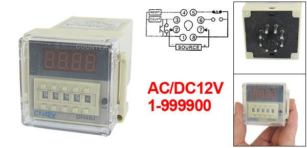 Product Name Digital Counter Relay Model DH48JA Count Range 1-999900 Power Source AC/DC12V, 50/60Hz Contact AC 250V 5A ( Resistive Load) Count Speed <300cps Digit Display 4 Pin Number 8 Marerial Plastic, Electrionic Parts Color Gray Size 10 x 5.5 x 5cm/4'' x 2.2'' x 2'' (L*W*H) Net Weight 95g Package Content 1 x Digital Counter Relay w Base