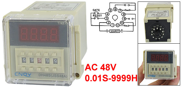 Product Name Digital Time Relay Type DH48S-11 Contact Type DPDT Rated Voltage AC 48V Frequency 50/60 Hz Contact AC 250V 5A Resistive Load Time Range 0.01S-9999H Panel Size 48 x 48mm/1.9" x 1.9"(L*W) Mounted Size 45 x 45 x 103mm/1.8" x 1.8" x 4.1"(L*W*Depth) Total Size 48.5 x 60 x 88mm/1.9" x 2.4" x 3.5"(L*W*H) Color Beige Net Weight 177g Package Content 1 x Digital Time Relay - Reviews