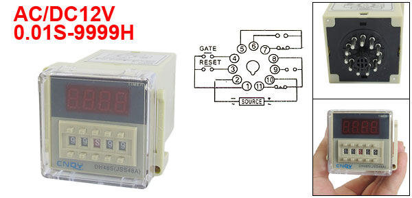 Product Name Digital Time Relay Type DH48S-11 Contact Type DPDT Rated Voltage AC/DC12V Frequency 50/60 Hz Contact AC 250V 5A Resistive Load Time Range 0.01S-9999H Panel Size 48 x 48mm/1.9" x 1.9"(L*W) Mounted Size 45 x 45 x 103mm/1.8" x 1.8" x 4.1"(L*W*Depth) Total Size 48.5 x 60 x 88mm/1.9" x 2.4" x 3.5"(L*W*H) Color Beige Net Weight 106g Package Content 1 x Digital Time Relay - Reviews
