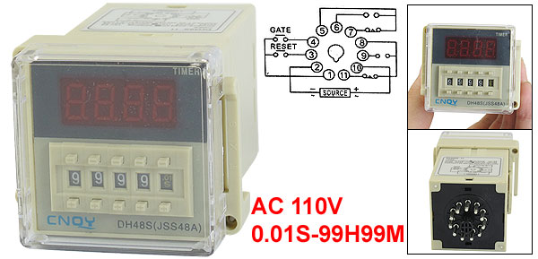 Product Name Digital Time Relay Type DH48S-11 Contact Type DPDT Rated Voltage AC 110V Frequency 50/60 Hz Contact AC 250V 5A Resistive Load Time Range 0.01S-99H99M Panel Size 48 x 48mm/1.9" x 1.9"(L*W) Mounted Size 45 x 45 x 103mm/1.8" x 1.8" x 4.1"(L*W*Depth) Total Size 48.5 x 60 x 88mm/1.9" x 2.4" x 3.5"(L*W*H) Color Beige Net Weight 184g Package Content 1 x Digital Time Relay - Reviews