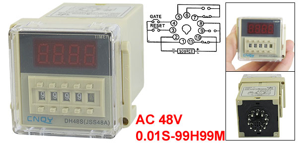 Product Name Digital Time Relay Type DH48S-11 Contact Type DPDT Rated Voltage AC 48V Frequency 50/60 Hz Contact AC 250V 5A Resistive Load Time Range 0.01S-99H99M Panel Size 48 x 48mm/1.9" x 1.9"(L*W) Mounted Size 45 x 45 x 103mm/1.8" x 1.8" x 4.1"(L*W*Depth) Total Size 48.5 x 60 x 88mm/1.9" x 2.4" x 3.5"(L*W*H) Color Beige Net Weight 179g Package Content 1 x Digital Time Relay - Reviews