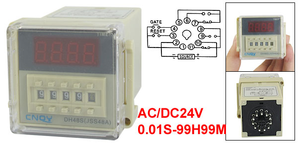 Product Name Digital Time Relay Type DH48S-11 Contact Type DPDT Rated Voltage AC/DC24V Frequency 50/60 Hz Contact AC 250V 5A Resistive Load Time Range 0.01S-99H99M Panel Size 48 x 48mm/1.9" x 1.9"(L*W) Mounted Size 45 x 45 x 103mm/1.8" x 1.8" x 4.1"(L*W*Depth) Total Size 48.5 x 60 x 88mm/1.9" x 2.4" x 3.5"(L*W*H) Color Beige Net Weight 108g Package Content 1 x Digital Time Relay - Reviews