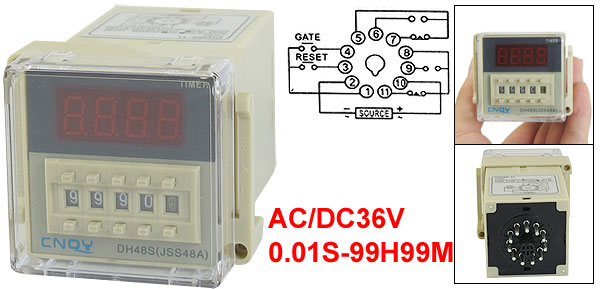 Product Name Digital Time Relay Type DH48S-11 Contact Type DPDT Rated Voltage AC/DC36V Frequency 50/60 Hz Contact AC 250V 5A Resistive Load Time Range 0.01S-99H99M Panel Size 48 x 48mm/1.9" x 1.9"(L*W) Mounted Size 45 x 45 x 103mm/1.8" x 1.8" x 4.1"(L*W*Depth) Total Size 48.5 x 60 x 88mm/1.9" x 2.4" x 3.5"(L*W*H) Color Beige Net Weight 108g Package Content 1 x Digital Time Relay - Reviews