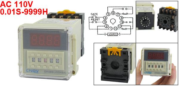 Product Name Digital Time Relay Type DH48S-11 Contact Type DPDT Rated Voltage AC 110V Frequency 50/60 Hz Contact AC 250V 5A Resistive Load Time Range 0.01S-9999H Mount Rail Type 35mm DIN Rail Base Mount Hole Size 4 x 5mm/0.16" x 0.2"(L*W) Panel Size 48 x 48mm/1.9" x 1.9"(L*W) Mounted Size 45 x 45 x 103mm/1.8" x 1.8" x 4.1"(L*W*Depth) Total Size 48.5 x 60 x 118mm/1.9" x 2.4" x 4.6"(L*W*H) Color Beige, Black Net Weight 230g Package Content 1 x Digital Time Relay w Socket - Reviews