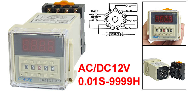 Product Name Digital Time Relay Type DH48S-11 Contact Type DPDT Rated Voltage AC/DC12V Frequency 50/60 Hz Contact AC 250V 5A Resistive Load Time Range 0.01S-9999H Mount Rail Type 35mm DIN Rail Base Mount Hole Size 4 x 5mm/0.16" x 0.2"(L*W) Panel Size 48 x 48mm/1.9" x 1.9"(L*W) Mounted Size 45 x 45 x 103mm/1.8" x 1.8" x 4.1"(L*W*Depth) Total Size 48.5 x 60 x 118mm/1.9" x 2.4" x 4.6"(L*W*H) Color Beige, Black Net Weight 152g Package Content 1 x Digital Time Relay w Socket - Reviews