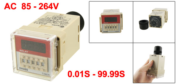 DetailsDH48S-1Z 0.1s-99.99s 4 Digits Electrical Time Relay AC 85-264V  Product Name Time Relay Model DH48S-1Z Working Voltage AC 85-264V Contact Capacity AC 250V 5A Resistive Load Time Range 0.01S-99.99S Total Size (Approx.) 120 x 53 x 50mm/ 4.7" x 2.1" x 2" (L*W*H) Weight 140g Package Content 1 x Time Relay