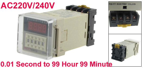 Product Name Time Relay Model DH48S-1Z Working Voltage AC 220V/240V, 50/60Hz Contact Capacity AC 250V, 5A Resistive Load Time Range 0.01 Second to 99 Hour 99 Minute Total Size (Approx.) 11 x 5.8 x 5.1cm/ 4.3" x 2.3" x 2" (L*W*T) Weight 220g Package Content 1 x Time Relay with Socket - Reviews