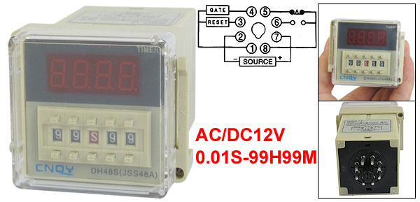 Product Name Digital Time Relay Type DH48S-1Z Contact Type SPST Rated Voltage AC/DC12V Frequency 50/60 Hz Contact AC 250V 5A Resistive Load Time Range 0.01S-99H99M Panel Size 50 x 50mm/2" x 2"(L*W) Mounted Size 45 x 45 x 73mm/1.8" x 1.8" x 2.9"(L*W*Depth) Total Size 50 x 60 x 88mm/2" x 2.4" x 3.5"(L*W*H) Color Beige Net Weight 96g Package Content 1 x Digital Time Relay - Reviews