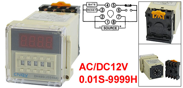 Product Name Digital Time Relay Type DH48S-1Z Contact Type SPST Rated Voltage AC/DC12V Frequency 50/60 Hz Contact AC 250V 5A Resistive Load Time Range 0.01S-9999H Mount Rail Type 35mm DIN Rail Base Mount Hole Size 4 mm/0.16" Panel Size 50 x 50mm/2" x 2"(L*W) Mounted Size 45 x 45 x 94mm/1.8" x 1.8" x 3.7"(L*W*Depth) Total Size 50 x 60 x 110mm/2" x 2.4" x 4.3"(L*W*H) Color Beige, Black Net Weight 128g Package Content 1 x Digital Time Relay w Socket - Reviews