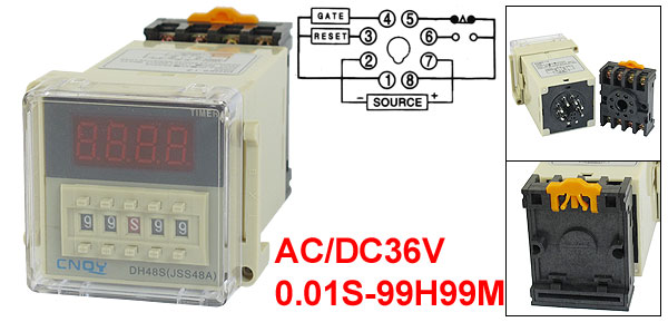 Product Name Digital Time Relay Type DH48S-1Z Contact Type SPST Rated Voltage AC/DC36V Frequency 50/60 Hz Contact AC 250V 5A Resistive Load Time Range 0.01S-99H99M Mount Rail Type 35mm DIN Rail Base Mount Hole Size 4 mm/0.16" Panel Size 50 x 50mm/2" x 2"(L*W) Mounted Size 45 x 45 x 94mm/1.8" x 1.8" x 3.7"(L*W*Depth) Total Size 50 x 60 x 110mm/2" x 2.4" x 4.3"(L*W*H) Color Beige, Black Net Weight 129g Package Content 1 x Digital Time Relay w Socket - Reviews