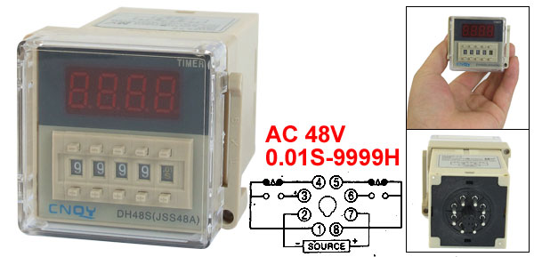 Product Name Digital Time Relay Type DH48S-2Z Contact Type DPDT Rated Voltage AC 48V Frequency 50/60 Hz Contact AC 250V 5A Resistive Load Time Range 0.01S-9999H Panel Size 50 x 50mm/2" x 2"(L*W) Mounted Size 45 x 45 x 72mm/1.8" x 1.8" x 2.8"(L*W*Depth) Total Size 50 x 60 x 87mm/2" x 2.4" x 3.4"(L*W*H) Color Beige Net Weight 176g Package Content 1 x Digital Time Relay - Reviews