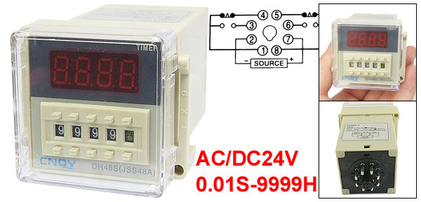 Product Name Digital Time Relay Type DH48S-2Z Contact Type DPDT Rated Voltage AC/DC24V Frequency 50/60 Hz Contact AC 250V 5A Resistive Load Time Range 0.01S-9999H Panel Size 50 x 50mm/2" x 2"(L*W) Mounted Size 45 x 45 x 72mm/1.8" x 1.8" x 2.8"(L*W*Depth) Total Size 50 x 60 x 87mm/2" x 2.4" x 3.4"(L*W*H) Color Beige Net Weight 105g Package Content 1 x Digital Time Relay - Reviews