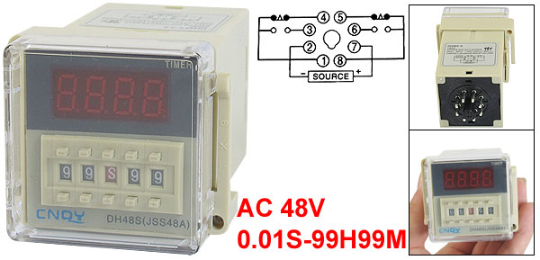 DetailsDH48S-2Z LCD Display Time Timer Delay Relay 8-Pin DPDT 0.01S-99H99M AC 48V  Product Name Digital Time Relay Type DH48S-2Z Contact Type DPDT Rated Voltage AC 48V Frequency 50/60 Hz Contact AC 250V 5A Resistive Load Time Range 0.01S-99H99M Panel Size 50 x 50mm/2" x 2"(L*W) Mounted Size 45 x 45 x 72mm/1.8" x 1.8" x 2.8"(L*W*Depth) Total Size 50 x 60 x 87mm/2" x 2.4" x 3.4"(L*W*H) Color Beige Net Weight 175g Package Content 1 x Digital Time Relay