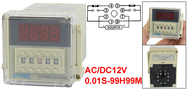Product Name Digital Time Relay Type DH48S-2Z Contact Type DPDT Rated Voltage AC/DC12V Frequency 50/60 Hz Contact AC 250V 5A Resistive Load Time Range 0.01S-99H99M Panel Size 50 x 50mm/2" x 2"(L*W) Mounted Size 45 x 45 x 72mm/1.8" x 1.8" x 2.8"(L*W*Depth) Total Size 50 x 60 x 87mm/2" x 2.4" x 3.4"(L*W*H) Color Beige Net Weight 104g Package Content 1 x Digital Time Relay - Reviews