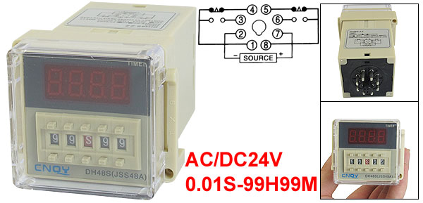 Product Name Digital Time Relay Type DH48S-2Z Contact Type DPDT Rated Voltage AC/DC24V Frequency 50/60 Hz Contact AC 250V 5A Resistive Load Time Range 0.01S-99H99M Panel Size 50 x 50mm/2" x 2"(L*W) Mounted Size 45 x 45 x 72mm/1.8" x 1.8" x 2.8"(L*W*Depth) Total Size 50 x 60 x 87mm/2" x 2.4" x 3.4"(L*W*H) Color Beige Net Weight 104g Package Content 1 x Digital Time Relay - Reviews
