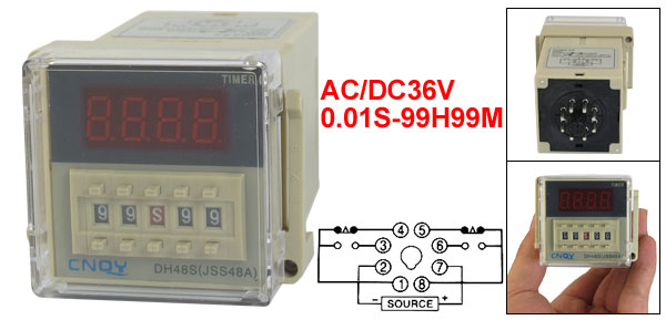 Product Name Digital Time Relay Type DH48S-2Z Contact Type DPDT Rated Voltage AC/DC36V Frequency 50/60 Hz Contact AC 250V 5A Resistive Load Time Range 0.01S-99H99M Panel Size 50 x 50mm/2" x 2"(L*W) Mounted Size 45 x 45 x 72mm/1.8" x 1.8" x 2.8"(L*W*Depth) Total Size 50 x 60 x 87mm/2" x 2.4" x 3.4"(L*W*H) Color Beige Net Weight 104g Package Content 1 x Digital Time Relay - Reviews