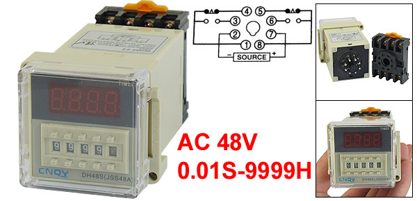 Product Name Digital Time Relay Type DH48S-2Z Contact Type DPDT Rated Voltage AC 48V Frequency 50/60 Hz Contact AC 250V 5A Resistive Load Time Range 0.01S-9999H Mount Rail Type 35mm DIN Rail Base Mount Hole Size 4 x 4mm/0.16" x 0.16"(L*W) Panel Size 50 x 50mm/2" x 2"(L*W) Mounted Size 45 x 45 x 95mm/1.8" x 1.8" x 3.7"(L*W*Depth) Total Size 48 x 60 x 109mm/1.9" x 2.4" x 4.3"(L*W*H) Color Beige, Black Net Weight 208g Package Content 1 x Digital Time Relay w Socket - Reviews