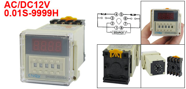 DetailsDH48S-2Z Power on Time Delay Relay 8-Pin DPDT 0.01S-9999H AC/DC12V w Socket  Product Name Digital Time Relay Type DH48S-2Z Contact Type DPDT Rated Voltage AC/DC12V Frequency 50/60 Hz Contact AC 250V 5A Resistive Load Time Range 0.01S-9999H Mount Rail Type 35mm DIN Rail Base Mount Hole Size 4 x 4mm/0.16" x 0.16"(L*W) Panel Size 50 x 50mm/2" x 2"(L*W) Mounted Size 45 x 45 x 95mm/1.8" x 1.8" x 3.7"(L*W*Depth) Total Size 48 x 60 x 109mm/1.9" x 2.4" x 4.3"(L*W*H) Color Beige, Black Net Weight 137g Package Content 1 x Digital Time Relay w Socket