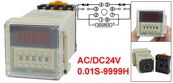 Product Name Digital Time Relay Type DH48S-2Z Contact Type DPDT Rated Voltage AC/DC24V Frequency 50/60 Hz Contact AC 250V 5A Resistive Load Time Range 0.01S-9999H Mount Rail Type 35mm DIN Rail Base Mount Hole Size 4 x 4mm/0.16" x 0.16"(L*W) Panel Size 50 x 50mm/2" x 2"(L*W) Mounted Size 45 x 45 x 95mm/1.8" x 1.8" x 3.7"(L*W*Depth) Total Size 48 x 60 x 109mm/1.9" x 2.4" x 4.3"(L*W*H) Color Beige, Black Net Weight 138g Package Content 1 x Digital Time Relay w Socket - Reviews
