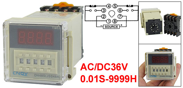 Product Name Digital Time Relay Type DH48S-2Z Contact Type DPDT Rated Voltage AC/DC36V Frequency 50/60 Hz Contact AC 250V 5A Resistive Load Time Range 0.01S-9999H Mount Rail Type 35mm DIN Rail Base Mount Hole Size 4 x 4mm/0.16" x 0.16"(L*W) Panel Size 50 x 50mm/2" x 2"(L*W) Mounted Size 45 x 45 x 95mm/1.8" x 1.8" x 3.7"(L*W*Depth) Total Size 48 x 60 x 109mm/1.9" x 2.4" x 4.3"(L*W*H) Color Beige, Black Net Weight 137g Package Content 1 x Digital Time Relay w Socket - Reviews