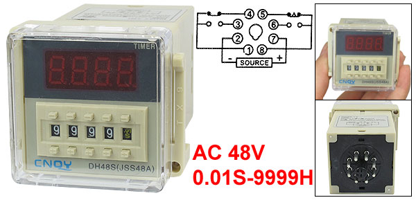 Product Name Digital Time Relay Type DH48S-2ZH Contact Type DPDT Rated Voltage AC 48V Frequency 50/60 Hz Contact AC 250V 5A Resistive Load Time Range 0.01S-9999H Panel Size 50 x 50mm/2" x 2"(L*W) Mounted Size 45 x 45 x 72mm/1.8" x 1.8" x 2.8"(L*W*Depth) Total Size 50 x 60 x 88mm/2" x 2.4" x 3.5"(L*W*H) Color Beige Net Weight 176g Package Content 1 x Digital Time Relay - Reviews