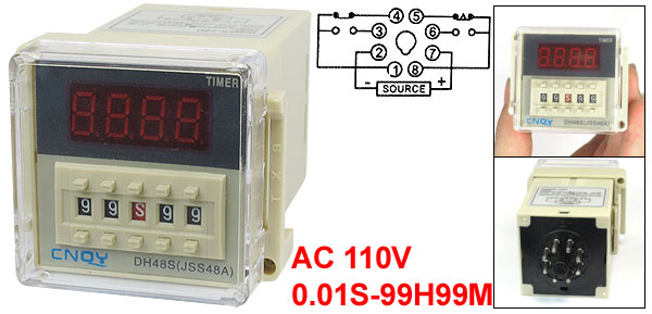 Product Name Digital Time Relay Type DH48S-2ZH Contact Type DPDT Rated Voltage AC 110V Frequency 50/60 Hz Contact AC 250V 5A Resistive Load Time Range 0.01S-99H99M Panel Size 50 x 50mm/2" x 2"(L*W) Mounted Size 45 x 45 x 72mm/1.8" x 1.8" x 2.8"(L*W*Depth) Total Size 50 x 60 x 88mm/2" x 2.4" x 3.5"(L*W*H) Color Beige Net Weight 182g Package Content 1 x Digital Time Relay - Reviews