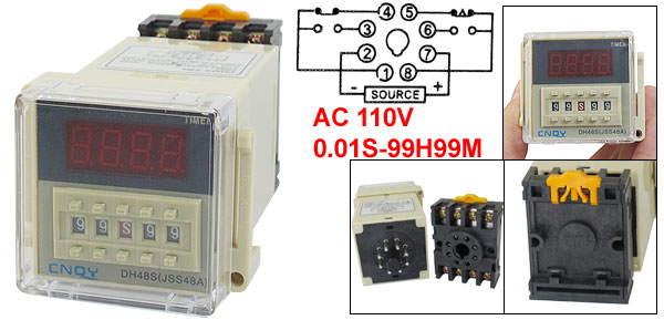 Product Name Digital Time Relay Type DH48S-2ZH Contact Type DPDT Rated Voltage AC 110V Frequency 50/60 Hz Contact AC 250V 5A Resistive Load Time Range 0.01S-99H99M Mount Rail Type 35mm DIN Rail Base Mount Hole Size 4 mm/0.16" Panel Size 50 x 50mm/2" x 2"(L*W) Mounted Size 45 x 45 x 94mm/1.8" x 1.8" x 3.7"(L*W*Depth) Total Size 50 x 60 x 119mm/2" x 2.4" x 4.7"(L*W*H) Color Beige, Black Net Weight 214g Package Content 1 x Digital Time Relay w Socket - Reviews