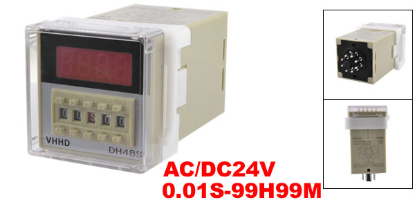 Product Name Digital Time Relay Type DH48S-2ZH Contact Type DPDT Rated Voltage AC/DC24V Frequency 50/60 Hz Contact AC 250V 5A Resistive Load Time Range 0.01S-99H99M Mount Rail Type 35mm DIN Rail Base Mount Hole Size 4 x 5mm/0.16" x 0.2"(L*W) Panel Size 48 x 48mm/1.9" x 1.9"(L*W) Mounted Size 45 x 45 x 103mm/1.8" x 1.8" x 4.1"(L*W*Depth) Total Size 48.5 x 60 x 118mm/1.9" x 2.4" x 4.6"(L*W*H) Color Beige, Black Net Weight 154g Package Content 1 x Digital Time Relay - Reviews