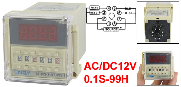 Product Name Digital Time Relay Type DH48S-S Contact Type SPST Rated Voltage AC/DC12V Frequency 50/60 Hz Contact AC 250V 5A Resistive Load Time Range 0.1S-99H Panel Size 50 x 50mm/2" x 2"(L*W) Mounted Size 45 x 45 x 72mm/1.8" x 1.8" x 2.8"(L*W*Depth) Total Size 50 x 60 x 88mm/2" x 2.4" x 3.5"(L*W*H) Color Beige Net Weight 97g Package Content 1 x Digital Time Relay - Reviews