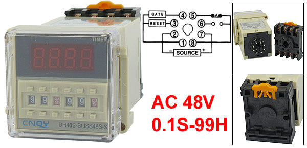 Product Name Digital Time Relay Type DH48S-S Contact Type SPST Rated Voltage AC 48V Frequency 50/60 Hz Contact AC 250V 5A Resistive Load Time Range 0.1S-99H Mount Rail Type 35mm DIN Rail Base Mount Hole Size 4mm/0.16" Panel Size 50 x 50mm/2" x 2"(L*W) Mounted Size 45 x 45 x 94mm/1.8" x 1.8" x 3.7"(L*W*Depth) Total Size 48.5 x 60 x 109mm/1.9" x 2.4" x 4.3"(L*W*H) Color Beige, Black Net Weight 199g Package Content 1 x Digital Time Relay w Socket - Reviews