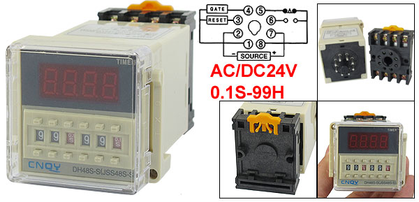 Product Name Digital Time Relay Type DH48S-S Contact Type SPST Rated Voltage AC/DC24V Frequency 50/60 Hz Contact AC 250V 5A Resistive Load Time Range 0.1S-99H Mount Rail Type 35mm DIN Rail Base Mount Hole Size 4mm/0.16" Panel Size 50 x 50mm/2" x 2"(L*W) Mounted Size 45 x 45 x 94mm/1.8" x 1.8" x 3.7"(L*W*Depth) Total Size 48.5 x 60 x 109mm/1.9" x 2.4" x 4.3"(L*W*H) Color Beige, Black Net Weight 130g Package Content 1 x Digital Time Relay w Socket - Reviews
