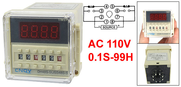 Product Name Digital Time Relay Type DH48S-S2Z Contact Type DPDT Rated Voltage AC 110V Frequency 50/60 Hz Contact AC 250V 5A Resistive Load Time Range 0.1S-99H Panel Size 50 x 50mm/2" x 2"(L*W) Mounted Size 45 x 45 x 73mm/1.8" x 1.8" x 2.9"(L*W*Depth) Total Size 50 x 60 x 87mm/2" x 2.4" x 3.4"(L*W*H) Color Beige Net Weight 183g Package Content 1 x Digital Time Relay - Reviews