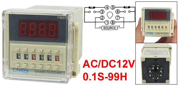 Product Name Digital Time Relay Type DH48S-S2Z Contact Type DPDT Rated Voltage AC/DC12V Frequency 50/60 Hz Contact AC 250V 5A Resistive Load Time Range 0.1S-99H Panel Size 50 x 50mm/2" x 2"(L*W) Mounted Size 45 x 45 x 73mm/1.8" x 1.8" x 2.9"(L*W*Depth) Total Size 50 x 60 x 87mm/2" x 2.4" x 3.4"(L*W*H) Color Beige Net Weight 106g Package Content 1 x Digital Time Relay - Reviews