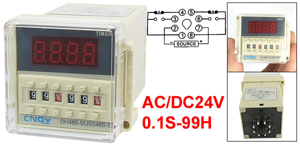 Product Name Digital Time Relay Type DH48S-S2Z Contact Type DPDT Rated Voltage AC/DC24V Frequency 50/60 Hz Contact AC 250V 5A Resistive Load Time Range 0.1S-99H Panel Size 50 x 50mm/2" x 2"(L*W) Mounted Size 45 x 45 x 73mm/1.8" x 1.8" x 2.9"(L*W*Depth) Total Size 50 x 60 x 87mm/2" x 2.4" x 3.4"(L*W*H) Color Beige Net Weight 106g Package Content 1 x Digital Time Relay - Reviews