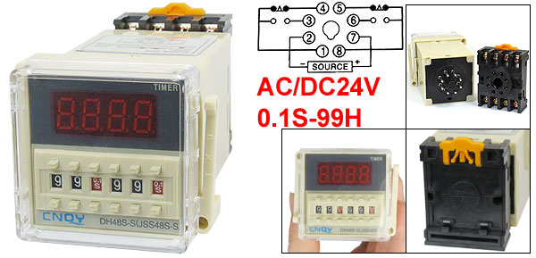 Product Name Digital Time Relay Type DH48S-S2Z Contact Type DPDT Rated Voltage AC/DC24V Frequency 50/60 Hz Contact AC 250V 5A Resistive Load Time Range 0.1S-99H Mount Rail Type 35mm DIN Rail Base Mount Hole Size 4 mm/0.16" Panel Size 50 x 50mm/2" x 2"(L*W) Mounted Size 45 x 45 x 94mm/1.8" x 1.8" x 3.7"(L*W*Depth) Total Size 50 x 60 x 118mm/2" x 2.4" x 4.6"(L*W*H) Color Beige, Black Net Weight 137g Package Content 1 x Digital Time Relay w Socket - Reviews