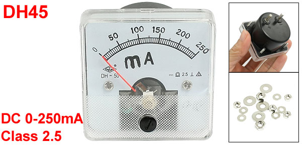 Product Name Analog Ammeter Model DH45 Measuring Range DC 0-250mA Accuracy Class 2.5 Meter Face Size(Approx) 5 x 5 x 1cm / 1.9" x 1.9" x 0.39"(L * W * T) Thread Size 0.3 x 0.9cm / 0.12" x 0.35"(D * L)